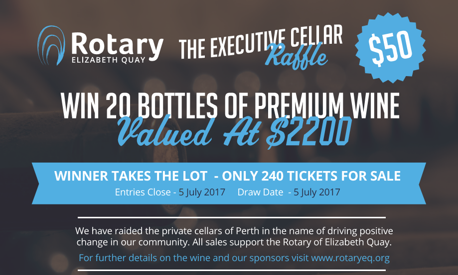 We are excited to launch our first club fundraiser to help us make an impact in the community. "The Executive Cellar" has raided the private cellars of 20 generous donors to provide you with the opportunity to build your cellar or start one! On the 5th of July one lucky ticket holder will win 20 fine bottles of wine at an average value of $110 per bottle.
